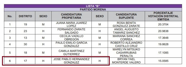 En vista de que todo apunta que Ángel Tamariz, diputado suplente de Fernando Zárate, declinará asumir la curul porque no va a renunciar al Gobierno de Clara Brugada, a quien le correspondería esa posición sería a José Pablo Hernández González, de acuerdo con lo establecido en el último párrafo del artículo 27 del Código de Instituciones y Procedimientos Electorales de la Ciudad de México, el cual dice a la letra: “Las vacantes de diputaciones de representación proporcional serán cubiertas por los suplentes de la fórmula electa respectiva. Si la vacante se presenta respecto de la fórmula completa, será cubierta por la fórmula de candidatos del mismo partido y género que siga en el orden de la lista respectiva”. En este caso, en la “Lista B” de plurinominales le toca a José Pablo Hernández González, porque tiene que ser del mismo género, como dice la Ley. Hernández González fue candidato a diputado local por el Distrito 17 de Benito Juárez, que perdió frente a Federico Chávez Semerena, del PAN, pero ahora en el inesperado repechaje de Lista B deberá asumir la curul que dejó Zárate. Por cierto, si él decidiera volver al Congreso, Hernández González tendría que dejar el escaño.