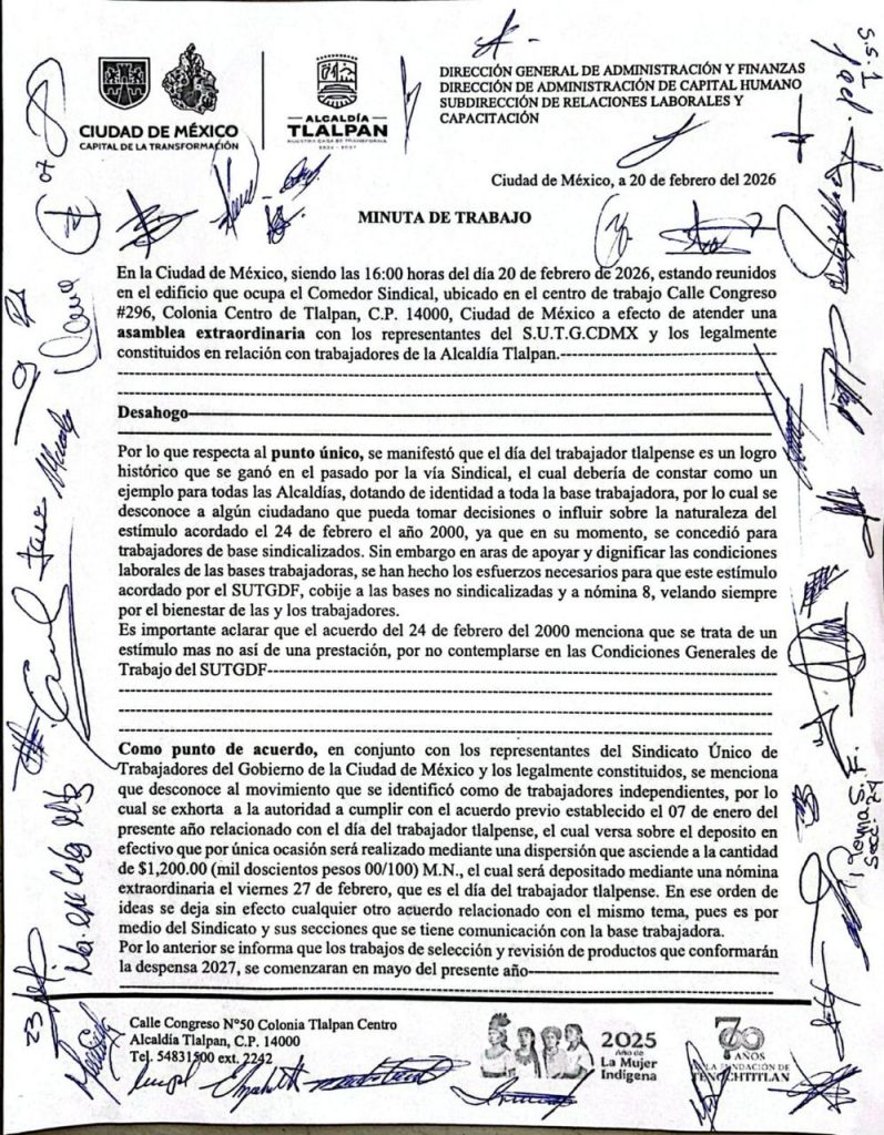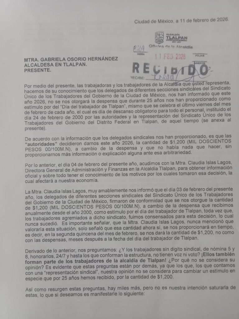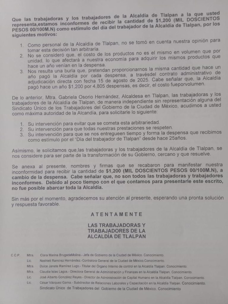 Otra vez, trabajadores de la Alcaldía Tlalpan acusaron a la edil de Morena, Gabriela Osorio de robarles dinero, de a 500 por cada uno de los 4 mil trabajadores, lo que suma 2 millones de pesos. ¿Dónde está el dinero? FOTO: Especial
